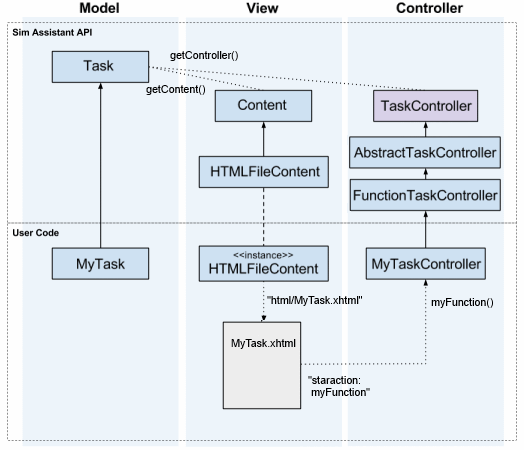 对于单个任务,模型(任务类)指定视图的类型(内容类)。模型还指定控制器(TaskController 类的衍生)来在运行时表示和控制其自身。当创建并显示任务时,视图和控制器实例化。对于任务,几乎总是需要创建模型(任务的衍生)和控制器(通常是 FunctionTaskController 的衍生)。使用包含或指向一些 XHTML 的其中一个预先存在内容类来指定视图类型。
