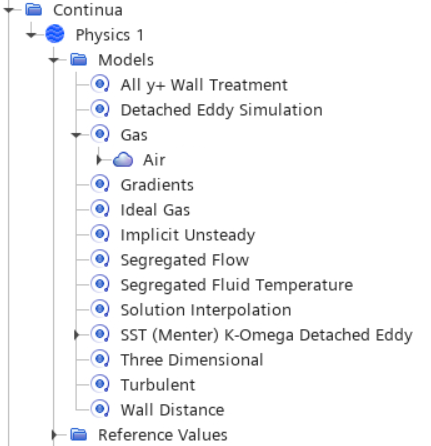 组合框 模型 时间 隐式不稳态 粘滞态 湍流 湍流 分离涡模拟 分离涡模拟 SST (Menter) K-Omega 分离涡 K-Omega 壁面处理 全 y+ 壁面处理 物理模型显示如下: