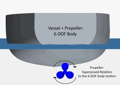 叠加运动主要用于具有多个区域的模拟。例如连接到船舶的旋转螺旋桨,其中系统船体 + 螺旋桨根据施加的流体力进行刚性移动。此外,螺旋桨还具有规定的旋转运动,如下所示: