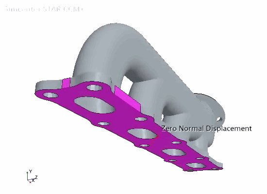 When constraining a part for thermal-structural analysis, it is important to avoid constraints that are too restrictive and lead to unrealistic stress concentrations. In this simulation, you constrain three mutually orthogonal surfaces on the manifold, thus preventing displacement in the direction normal to surfaces. This set of constraints prevents rigid body motion while allowing free expansion of the solid structure.