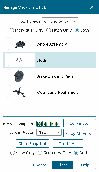 - 使用更新按钮恢复快照时,可以选择恢复视图信息(仅视图)、几何信息(仅几何),或同时恢复几何信息和视图信息(两者)。仅当分组操作设为新建时,这些选项才可用。