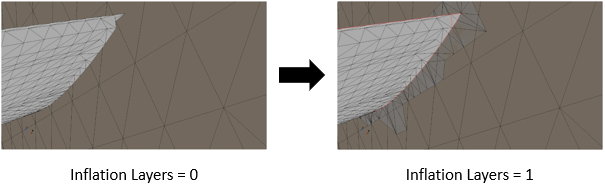 The inflation layers define the number of mesh layers add to or subtracted from the surface of interest. Unlike volume extents the surface of interest is only considered at the start of the wrapping process when you define the inflation layers. By defining the number of inflation layers you can improve the robustness of the local wrapper operation and remove gaps between the local and global wrap.