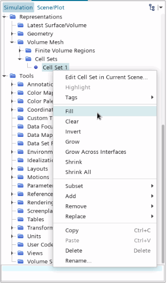 要访问网格单元集填充选项,右键单击所需的网格单元集节点,然后从弹出菜单中选择: