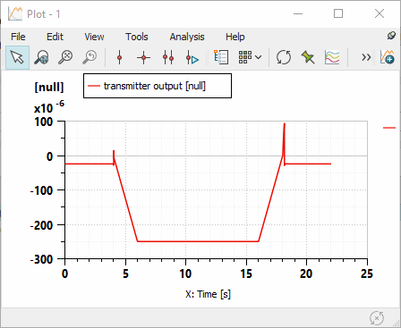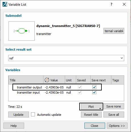 - 在变量列表对话框中,选择 transmitter output(传输器输出)或 transmitter input(传输器输入),因为此传输器输入力等于输出力,然后单击绘图。