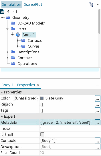 单击确定将应用元数据文本,必要时还将重新组织文本,以符合 Simcenter STAR-CCM+ 的要求。之后可以在零部件的属性窗口中检查元数据: