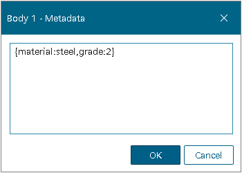 关键词通常是零部件的属性,如“材料”、“颜色”或“等级”。值是各自的数量或标识符,如“钢铁”、“蓝色”或“2”。值可以是一个字符串(单词)或整数。为了创建有效的元数据输入,必须同时指定键和值。可以为每个几何零部件指定一个或多个元数据。