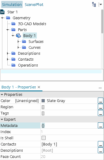 元数据也可用作一个过滤器或一系列过滤器的一部分,以便在 Simcenter STAR-CCM+中在后面阶段帮助确定和选择部件。元数据说明符对模拟没有影响,仅作为组织功能提供。