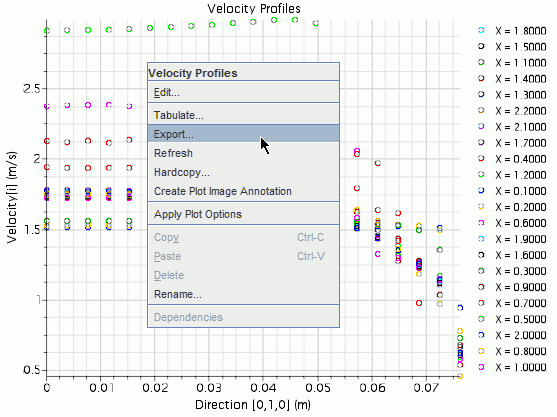 导出 XY 绘图数据 速度分布绘图包含的数据可导出至文本文件中。 右键单击速度分布绘图的背景,然后从弹出菜单中选择导出。 在保存对话框中,将文件名设为 exported_velocities。 单击保存。 速度分布绘图包含的所有数据已写入逗号分隔的变量(CSV) 文件中。可以将该类型的文件导入电子表格软件,用于进一步分析。