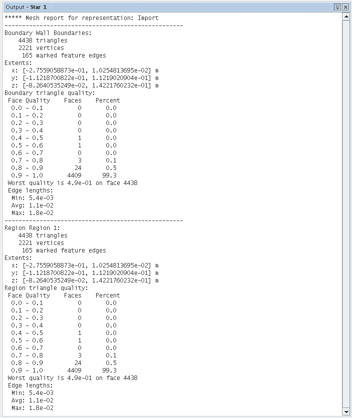 三角形质量将以 0 到 1 的 10 个单独区段列出,其中 1 表示质量最佳。边长统计数据可用于测量要用作包面和/或表面重构工具输入的初始基础值。