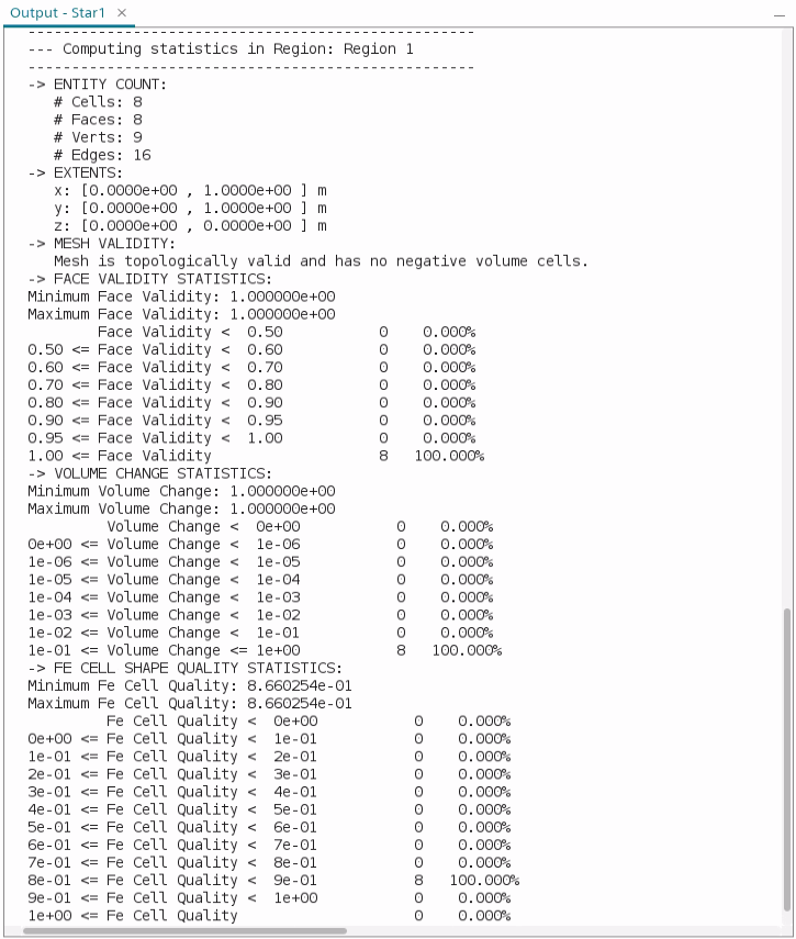 对于压缩报告,实体计数汇总了该区域的网格单元数、面数、节点数和边数。完整报告中将更详细地列出使用的不同网格单元形状的明细数据。请参见解释完整报告。