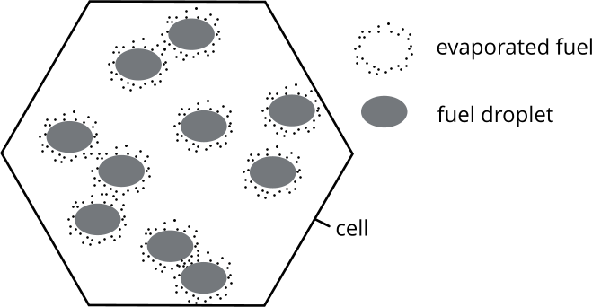 在燃料液滴在整个电池单元中蒸发和均匀混合之前,蒸发的燃料最初位于紧密接近燃料液滴的位置。燃料饱和分布模型使用燃料质量分数分布来考虑电池单元中燃料质量分数的初始不均匀分布。