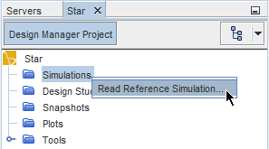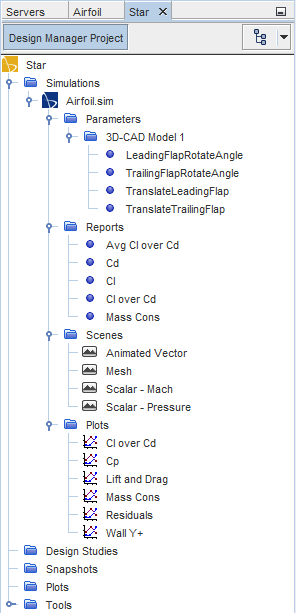 示例:以下屏幕截图显示了从参考模拟传递参数、报告、场景和绘图后的Design Manager对象树。