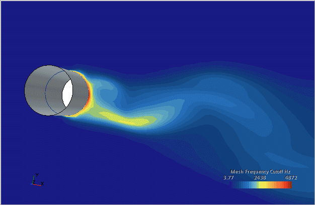 此绘图指出,在 Proudman 相关性所指示的主体声源区域内,网格的分辨率最大可达到约 2000 Hz。在网格单元为非各向同性的边界拉伸层内,网格频率截止的估计值会变得不准确。 - 保存模拟。