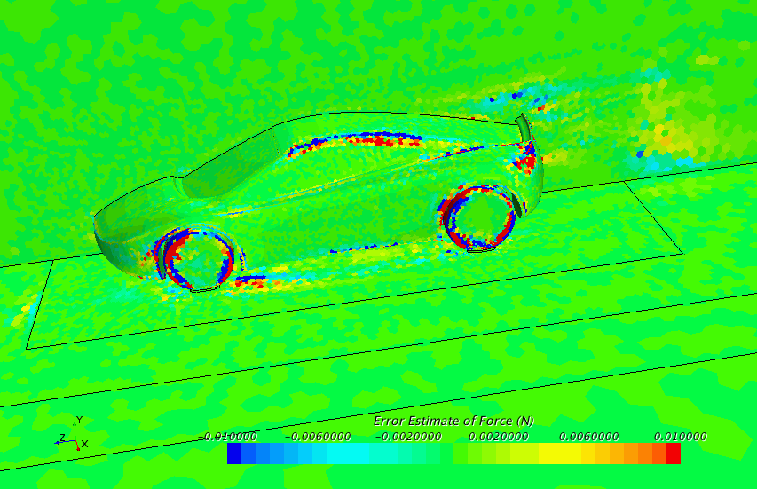 对于每个定义的成本函数,场函数将变为可用。在下图中,可以看到成本函数力(此处是指 Z 方向上对应于曳力的分力)的伴随误差估计的等值线图。此成本函数适用于汽车周围的空气动力学模拟。