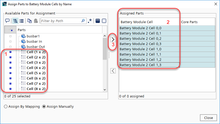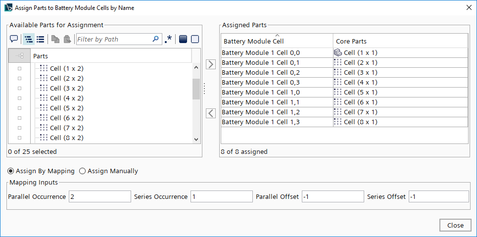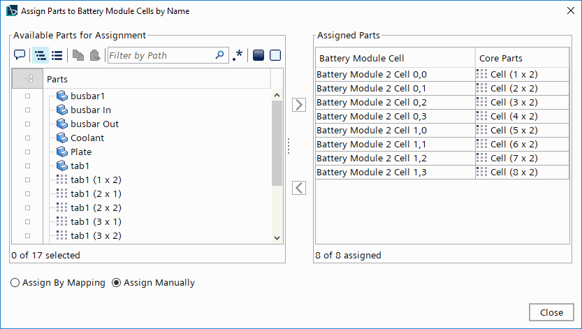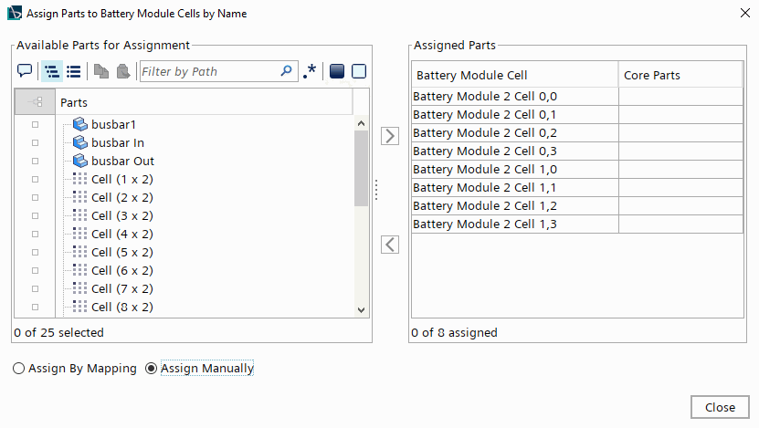 按名称将部件分配给电池模块电芯工具提供了将部件分配给其相应电池模块电芯的灵活方法。按映射分配选项很有用,但也可以选择手动将部件分配给电池模块电芯。
