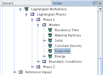 Simcenter STAR-CCM+ 使用外部文件来记录颗粒轨迹数据,因为有可能在模拟期间生成和重新生成大量数据。保存此类数据以供后续的可视化和分析使用。它在对象树中由轨迹文件节点(以下屏幕截图中的 intake(进气))表示,此节点位于轨迹文件管理器节点下,具有属性和弹出菜单,可以进行重命名或将其删除。