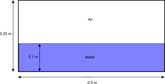 本教程演示设置尺寸为 0.5 m(长)x 0.02 m(宽)x 0.25 m(高)的容器内水晃动模拟的工作流。水最初在容器的下半部分处于静止状态,如下图所示: