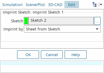 此时将显示压印草图面板,并在 3D-CAD 视图场景中高亮显示选定的草图,如上所示。