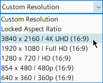 如果为 Aspect Ratio(长宽比) 属性选择了除 Fit Screen(布满屏幕)(例如 16:9)以外的选项,则下拉列表中包含一组与该长宽比关联的预定义分辨率选项。