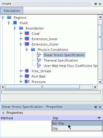 要设置区域、边界或交界面的条件,可打开对应于特定区域、边界或交界面的节点。 然后打开条件节点,选择所需的条件。 在属性窗口中,从对应于方法属性的下拉列表中选择一个可用的选项。