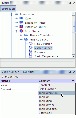 要设置区域、边界或交界面的值,应首先设置条件。 设置条件后,打开值节点并选择所需分布的节点。 默认情况下,假设使用最简单的方法,即用于大多数分布类型的常数法。 要更改此方法,可在对应于属性窗口中的方法属性的下拉列表中选择一项(以下屏幕截图中的表(迭代))。