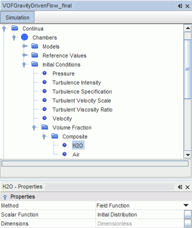 连续体中的两个流体空间分布的初始条件是:只在左腔室中注入水,在右腔室和通道内注入空气。两种流体均是静止的。指定这种分布的便捷方法是创建并使用场函数。