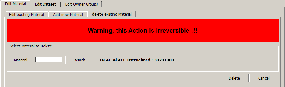 - 单击删除,从数据库中移除材料及其所有相关数据集,此操作不可逆转。