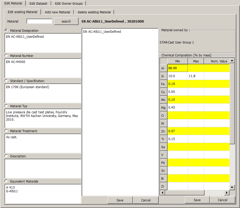 - 要更改选项卡左侧选定材料的某种常规信息(请参见编辑材料选项卡参考),激活相关复选框。根据需要在选项卡中心的编辑框中编辑信息,然后单击保存。