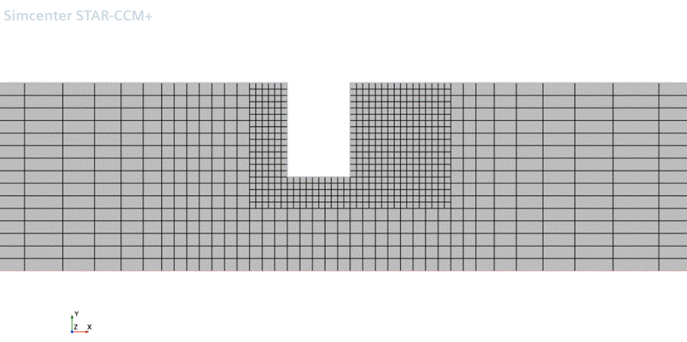 此网格表示管道几何的轴对称部分。网格在径向上具有均匀的间隔,并且在长度方向上具有双曲线变化。最小间距位于孔口所在管道的中心。