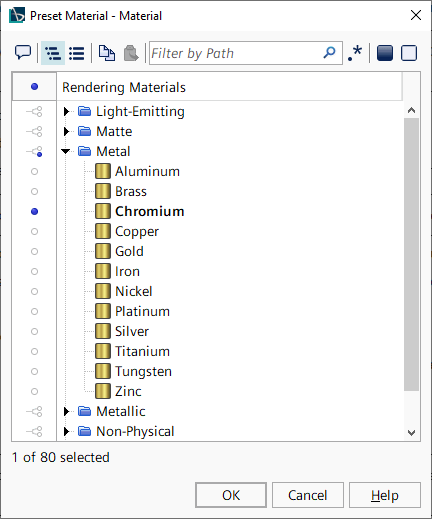 注 建议仅对水密和/或闭合几何使用此材料。要确保针对几何的单个片体生成准确结果,使用“透明”。 - 金属:逼真地模拟金属外观(例如,金、铜)的材料。此材料包含来自物理源的实际照明数据。请参见额外渲染材料 - 值。