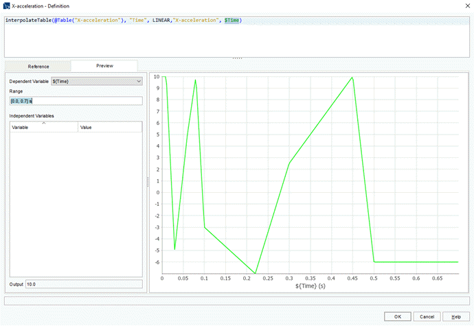 X-acceleration(X 轴加速度) 场函数用于指定驱动储罐晃动的重力矢量的非稳态水平分量。场函数对原始模拟文件中存储的 X 轴加速度表提供的分布进行插值。