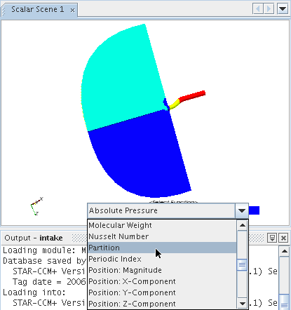 查看分区 可采用与任何其他标量相同的方法可视化模拟数据的分布:将标量场景或标量显示器添加到现有场景中,然后将标量选择(场函数)更改为 Partition(分区)。 根据由 Simcenter STAR-CCM+ 向单元格所分配的分区对单元格进行着色。
