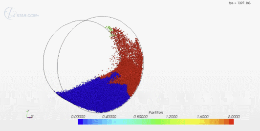 这两个求解器可一起运行。 拉格朗日求解器会收集再平衡域所需的信息并将其传递到分区求解器。 分区求解器将按正常方式考虑到所有负载平衡标准,协调最终的负载平衡。 此方法可以根据不断变化的颗粒分布来优化域分解。 当颗粒在整个域内迁移时,所有核心中的计算负载均保持平衡。