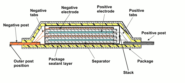 - 进行电化学反应的电芯组件(每个电极有一个极耳)。电极由金属箔加涂层组成。正电极通常是铝箔加金属氧化物或金属磷酸盐,而负电极则通常是铜加石墨膏。