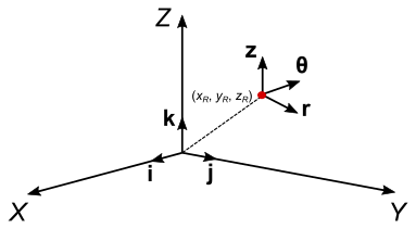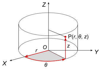 对于圆柱对称的物理域(例如绕轴旋转不变的坐标系),可以很方便地相对于圆柱坐标系来定义物理量。 在圆柱坐标系中,点的位置由其径向、切向和轴向坐标 、 和 给定: