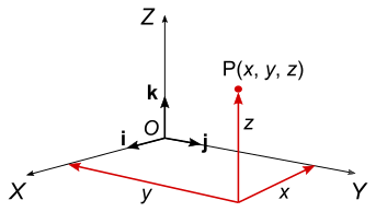 笛卡尔坐标系由三个在原点处汇合的右旋相互正交轴(通常标记为 X、Y 和 Z)来定义。 点的位置由其沿坐标系轴的 x、y 和 z 坐标给定。 矢量相对于与 X、Y 和 Z 轴对齐的单位基矢量(请参见 Eqn. (5185))进行描述。 定义笛卡尔坐标系的单位基矢量通常标记为 i、j 和 k。