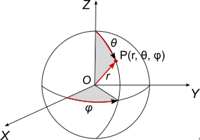 对于球对称的物理域(例如绕点旋转不变的坐标系),可以很方便地相对于球坐标系来定义物理量。 在球坐标系中,点的位置由其径向、极坐标和方位角坐标 、 和 给定: