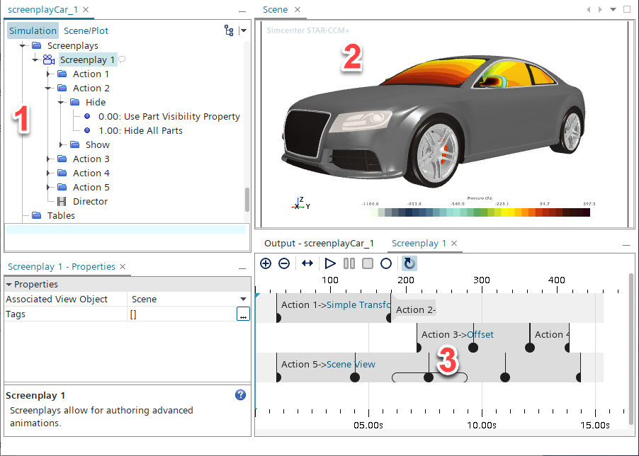 剧本是 Simcenter STAR-CCM+ 中的集成动画工具,可用于描述模拟的品质因素。剧本中使用的底层技术称为关键帧动画。