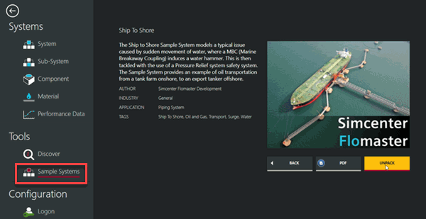 Simcenter Flomaster 提供大量示例系统作为预定义模板。从模板系统“船到岸”启动 Flomaster 模型,用于对水突然流动引起的典型问题进行建模。