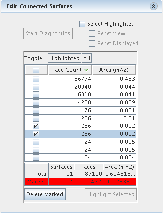 要使用总结表删除不需要的表面,应先生成相连表面诊断。 随后可以使用以下方法在总结表中将表面标记为删除: