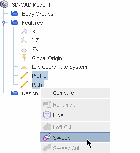 (扫掠)。 - 在 3D-CAD 视图窗口中右键单击,然后选择或扫掠剪切。