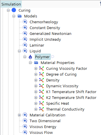 固化是一个非稳态、非等温过程。聚合物材料通过广义牛顿流体模型建模。化学流变学模型跟踪固化度。固化度会改变聚合物的粘度,这可以根据 Viscosit-Macosko 通过固化粘度因子来解释。根据阿雷尼乌斯 (Arrhenius) 定律,Eqn. (5246) 中的动力学速率常数 和 取决于温度。