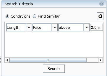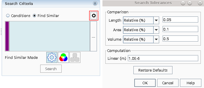 - 搜索容差:可用于在比较拓扑或搜索实体时指定容差值。此选项位于搜索准则框的右上方,请参见下图。有关更多信息,请参见搜索工具参考。