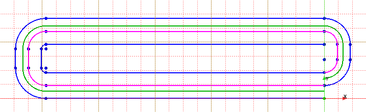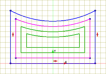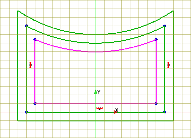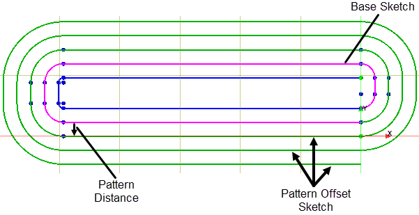 下图显示以紫色高亮显示的基础草图和以绿色高亮显示的阵列偏移。注意如何设计基础草图才能使连续阵列偏移形成单一连续路径。完成此类草图后,可以沿路径的整个长度扫掠特征轮廓。