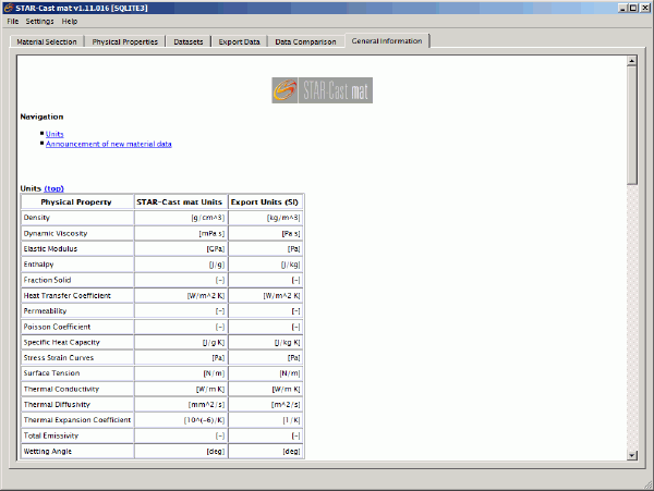 General Information(常规信息) 面板将显示铸造材料数据库使用的单位,并列出最近添加到数据库的新材料名称。