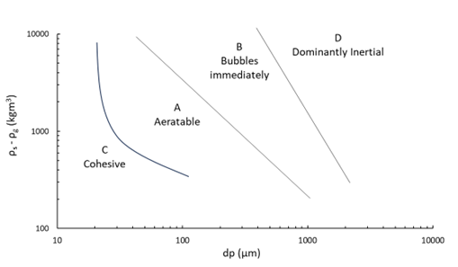- is the heterogeneity index which represents the ratio of the mean drag force that is experienced by particles in a heterogeneous system to the drag force in a homogeneous system. In Simcenter STAR-CCM+, the Lu, Wang and Li correlation ([509]) is used to define the heterogeneity index for both Geldart A and B particle groups and bubbly, fast, and pneumatic fluidization regimes. The flow regimes are identified based on the gas velocity and the resulting fluidization characteristics in the system ([469]).The Geldart classification system groups particles based on their size, density, and fluidization characteristics.