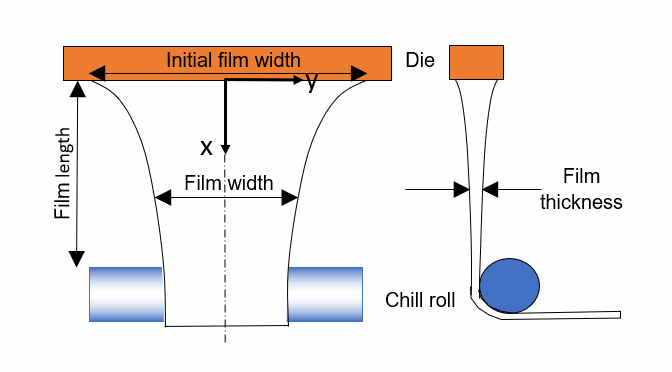 该图显示聚合物膜如何在由于质量守恒而退模后在宽度(缩口)和厚度方面减小。液膜铸造工艺取决于影响液膜形成的多个参数,包括: