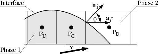 其中, 为标准化压缩面值, 为混合合作伙伴的标准化面值。 为混合函数,它取决于交界面法向 和网格单元面的表面矢量 之间的夹角 。下图显示了两个流体之间的交界面以及所用的符号。