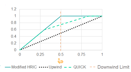 然后,标准化网格单元值 确定迎风值和顺风值的混合比,用于定义网格单元面的体积分数值。为降低 Eqn. (2597) 中的体积分数梯度的网格依赖性,将梯度 替换为平滑版本。这会降低外插迎风值 对网格的依赖性,从而提高 HRIC 格式在各向异性网格上的行为稳定性。