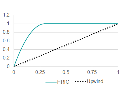 并且它只在瞬态模拟中发挥作用。 和 的默认值分别为 0.5 和 1。引入它们的目的是根据库朗数控制 HRIC 和 FOU 格式的混合。当 时,将使用 HRIC 方案,当 时,将使用 HRIC 和 FOU 的混合,当 时,将使用 FOU。